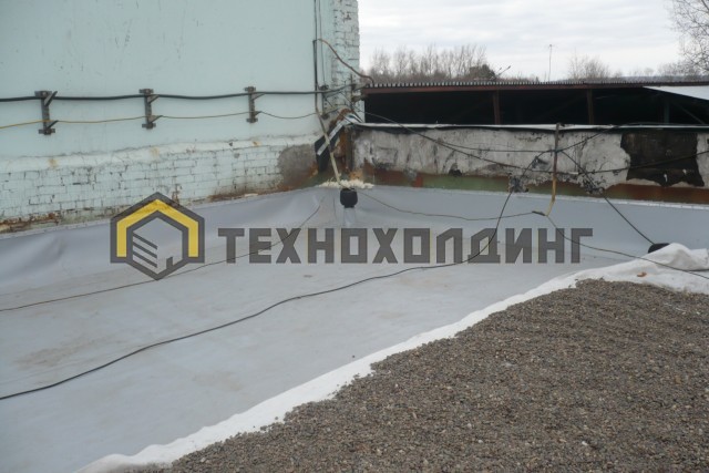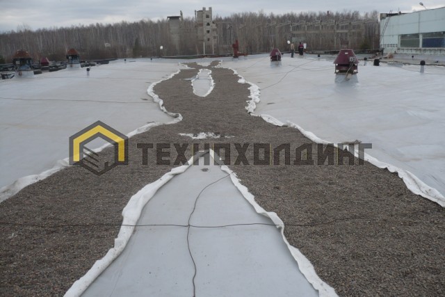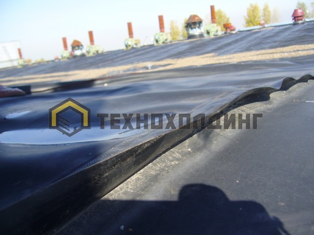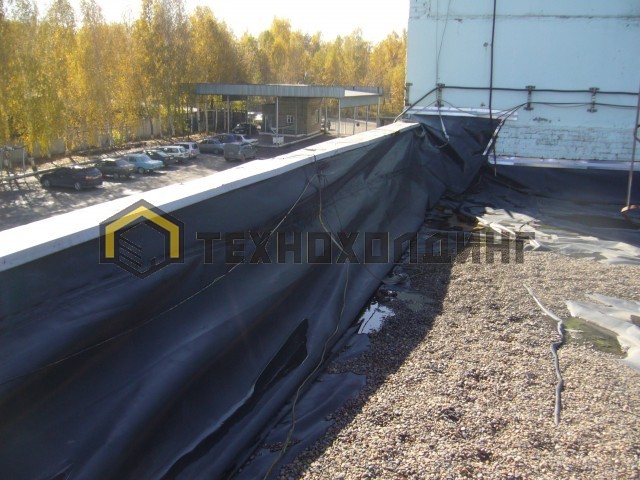 Замена ранее смонтированой мембраны, на полимерную мембрану Logicroof RP с механическим и балластным способом закрепления. На фото приведены кадры кровли после ремонтных работ и до.